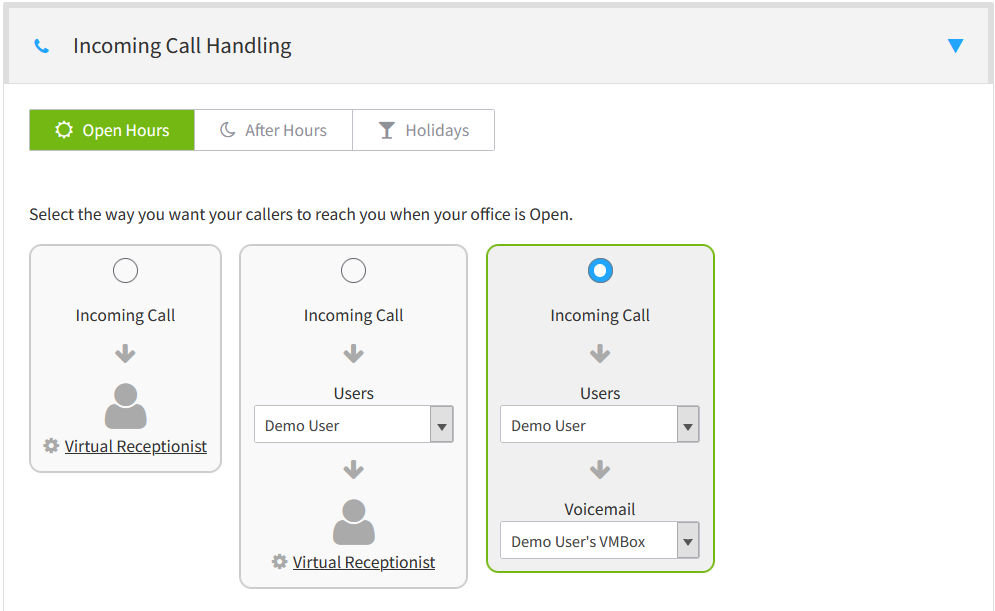 - You will find different tabs for Open Hours, After Hours, and Holidays, allowing you to customize call handling based on your Office Hours Strategy and Office Holidays settings.